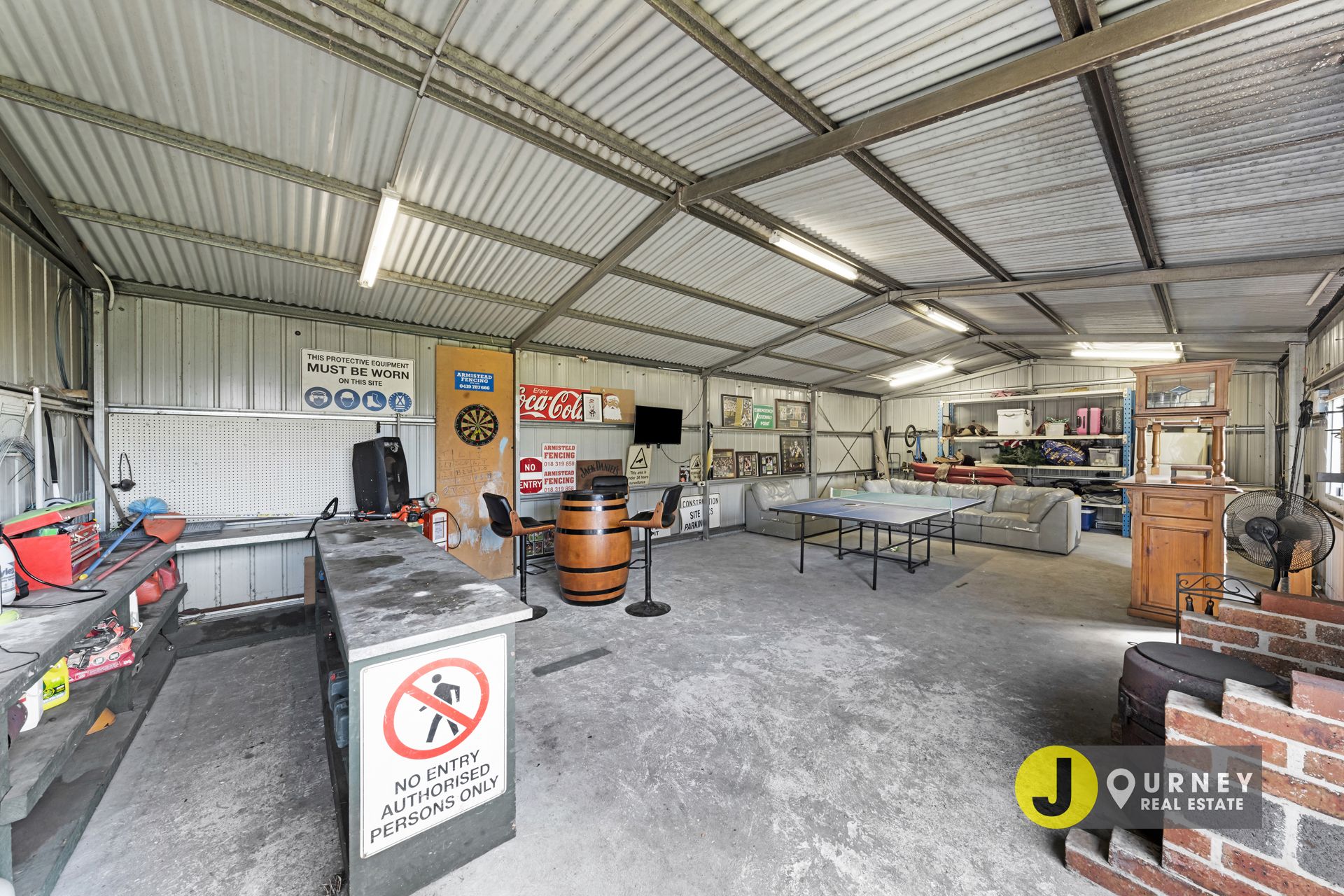 The exterior of the property is equally inviting, featuring a pergola that extends the living space outdoors, ideal for hosting gatherings or simply unwinding while enjoying the surrounding garden and landscape. A 12m by 6m shed provides ample storage or workspace, catering to various hobbies or storage needs. The property also includes a double garage with rear roller door access, ensuring convenience and security for vehicles and additional storage.