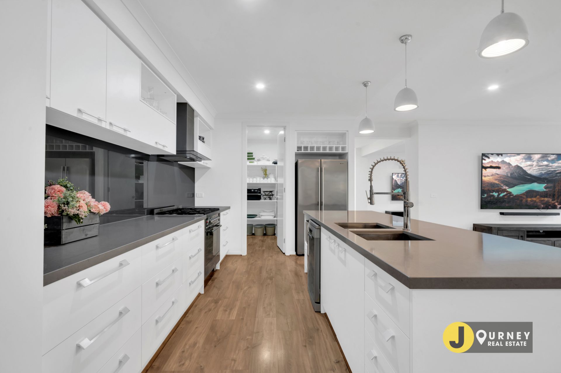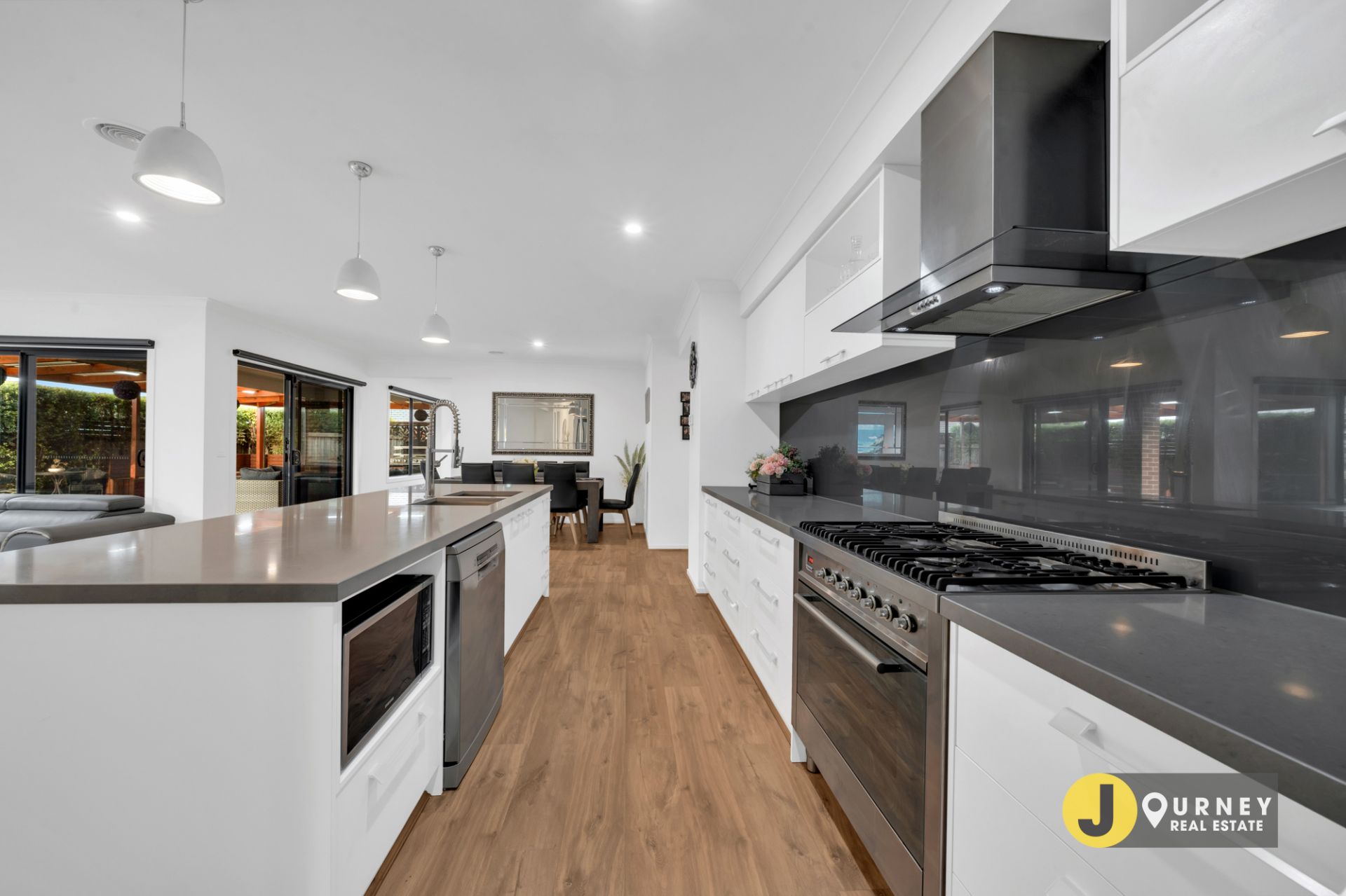 - The stunning kitchen showcases a stone island bench top with stylish glass splashbacks, stainless steel appliances including a five burner 900mm gas cooktop and oven as well as a dishwasher plus a fantastic walk-in butler's pantry and an abundance of cupboard space