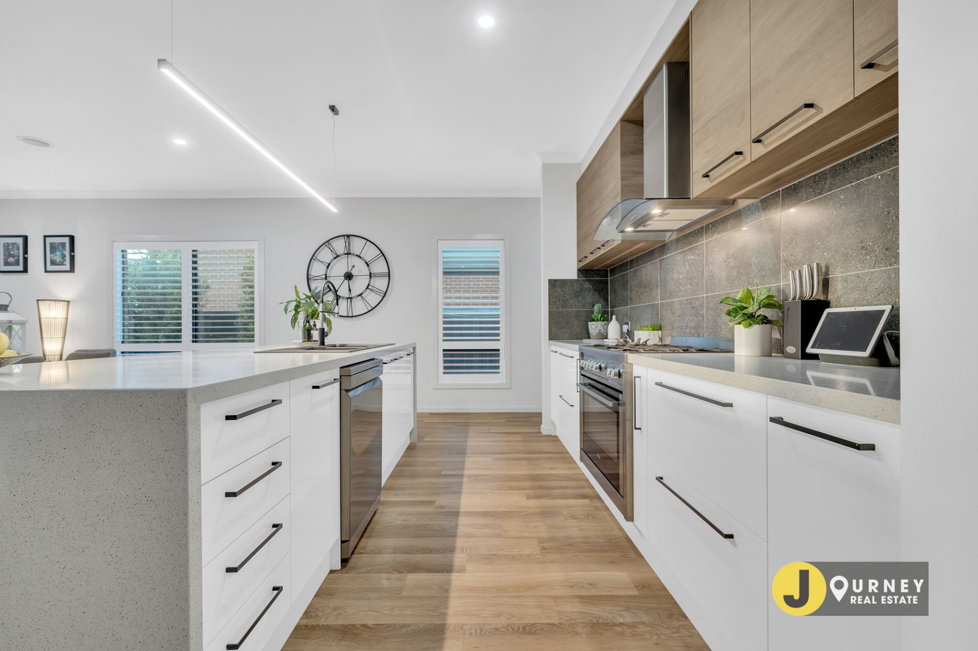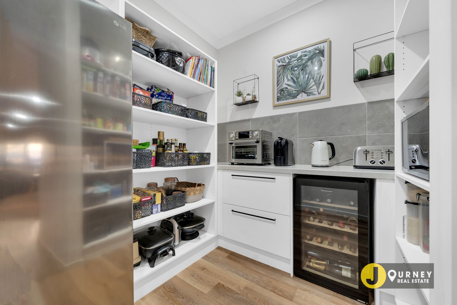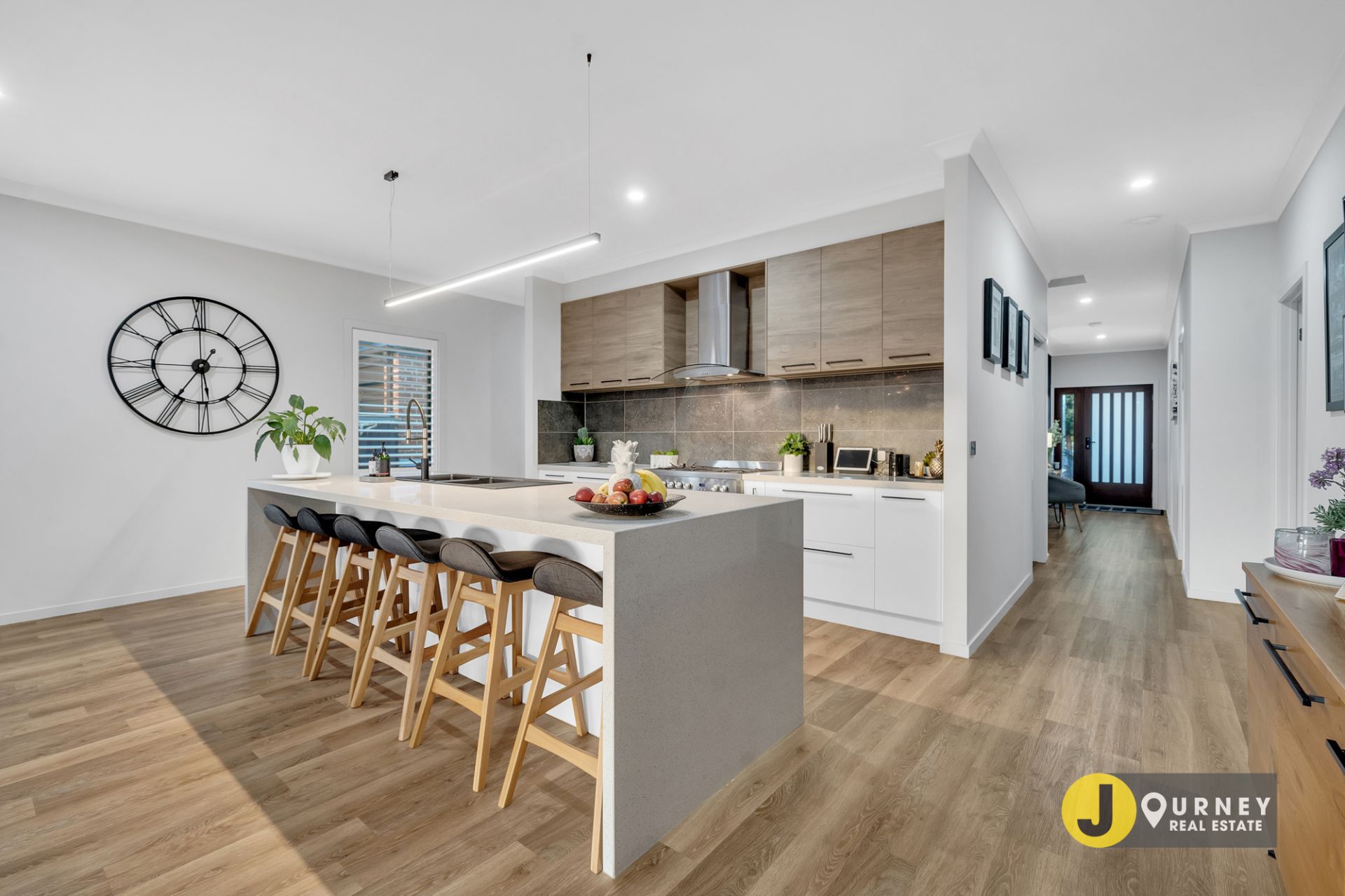 - Hostess kitchen with 40 mm waterfall, stone bench top and walk in pantry.