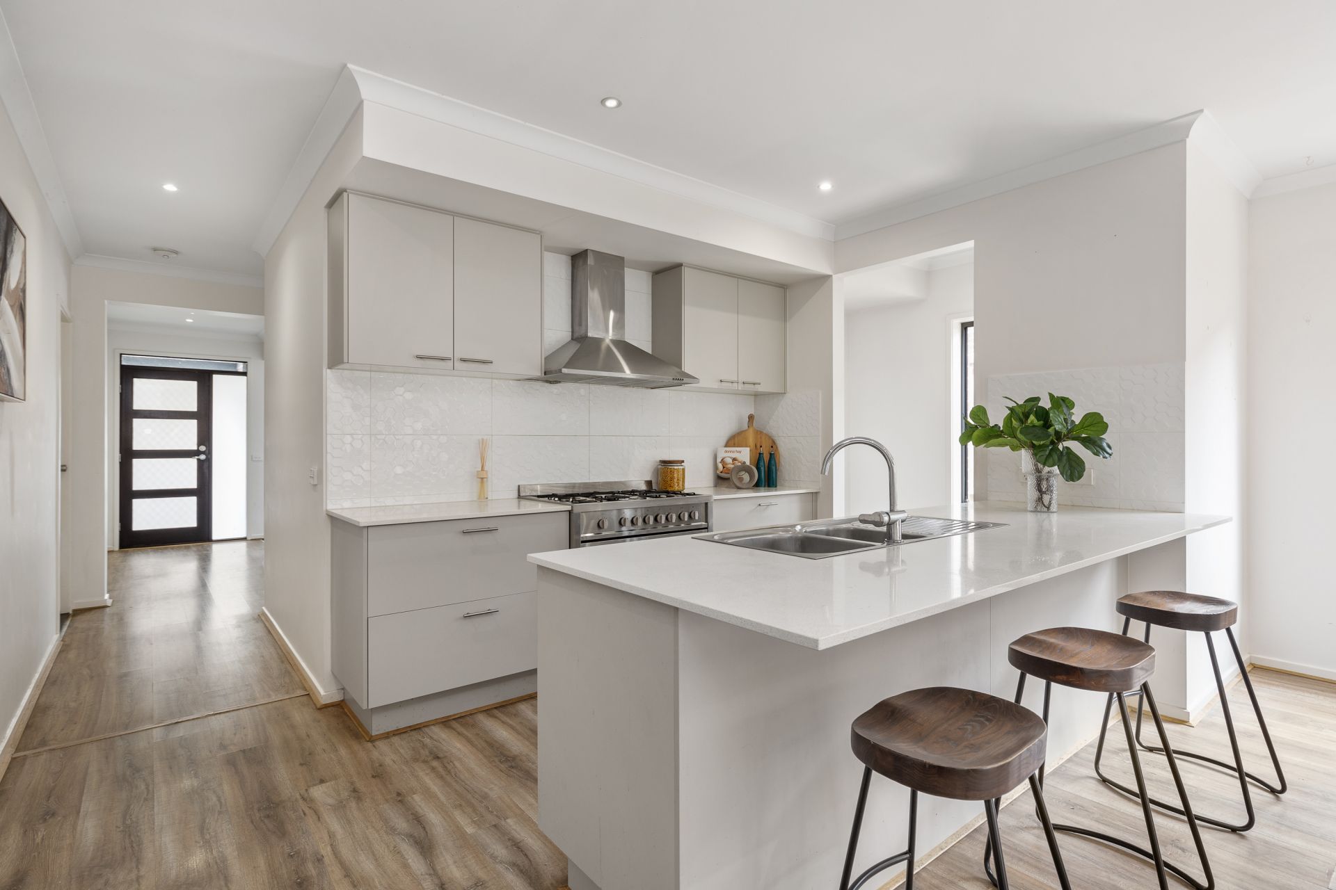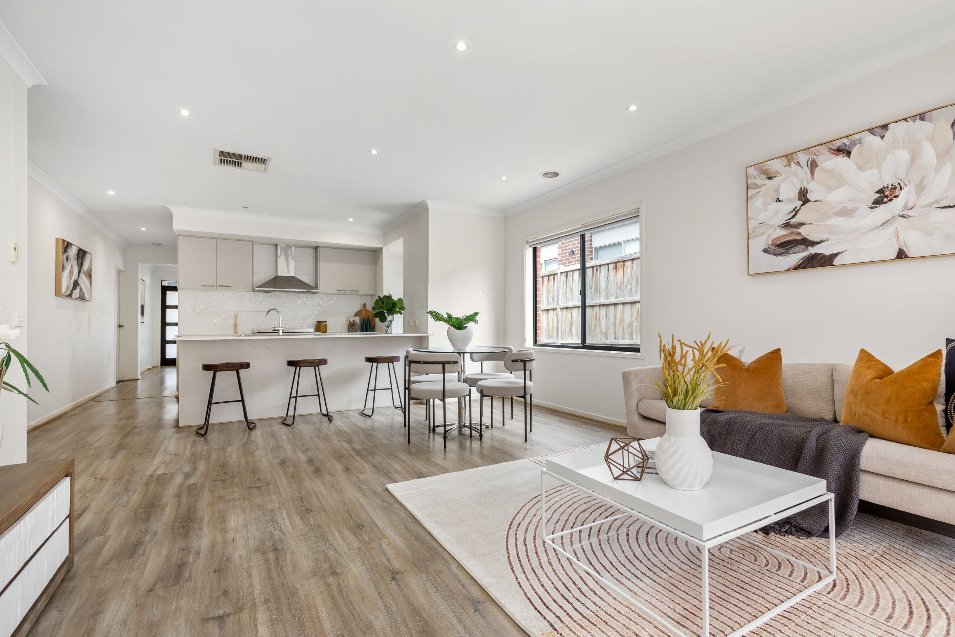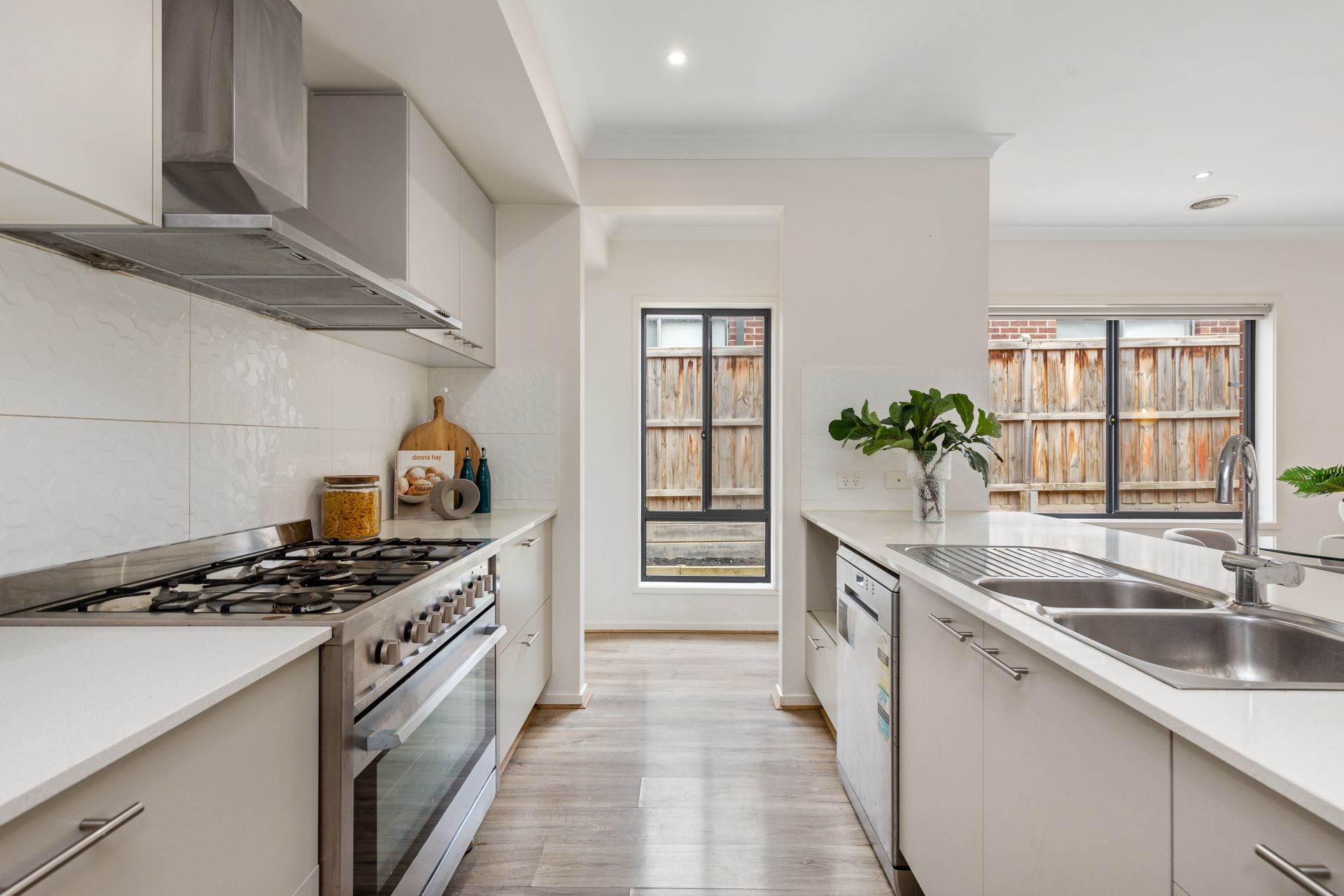 At the heart of the home, you will find a kitchen outfitted with 900mm stainless steel appliances, dishwasher and a walk-in pantry with dedicated fridge space. The open plan living and dining areas are illuminated by sleek downlights, and two separate living zones providing flexibility for entertaining, relaxing, or working from home.