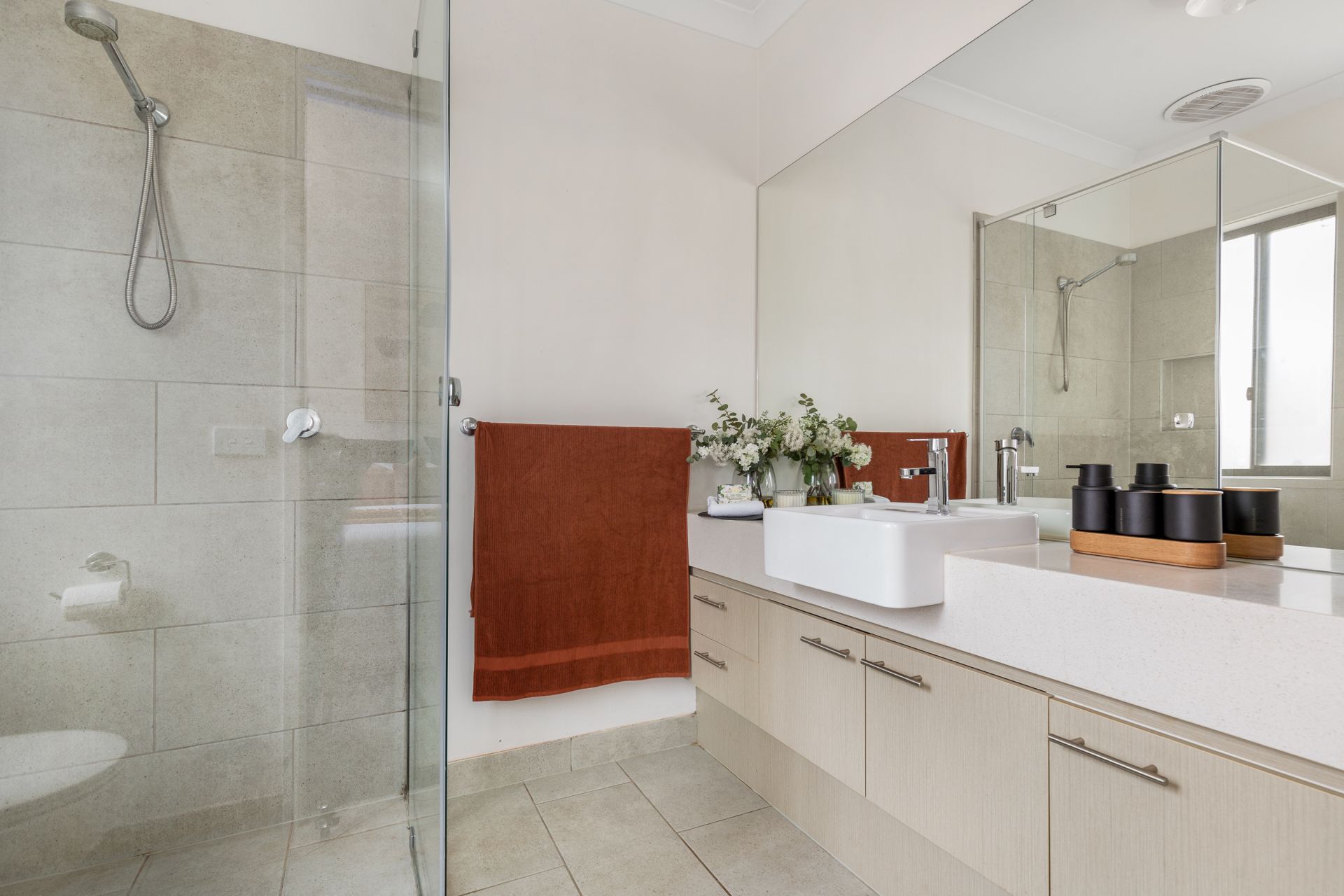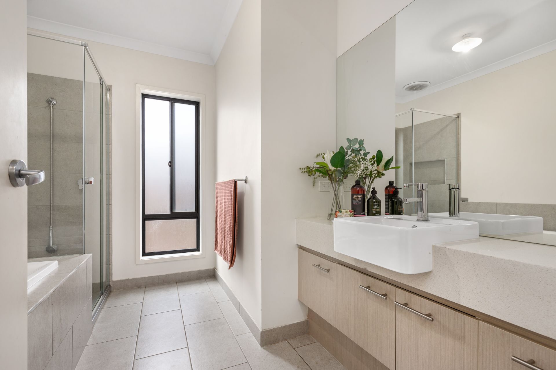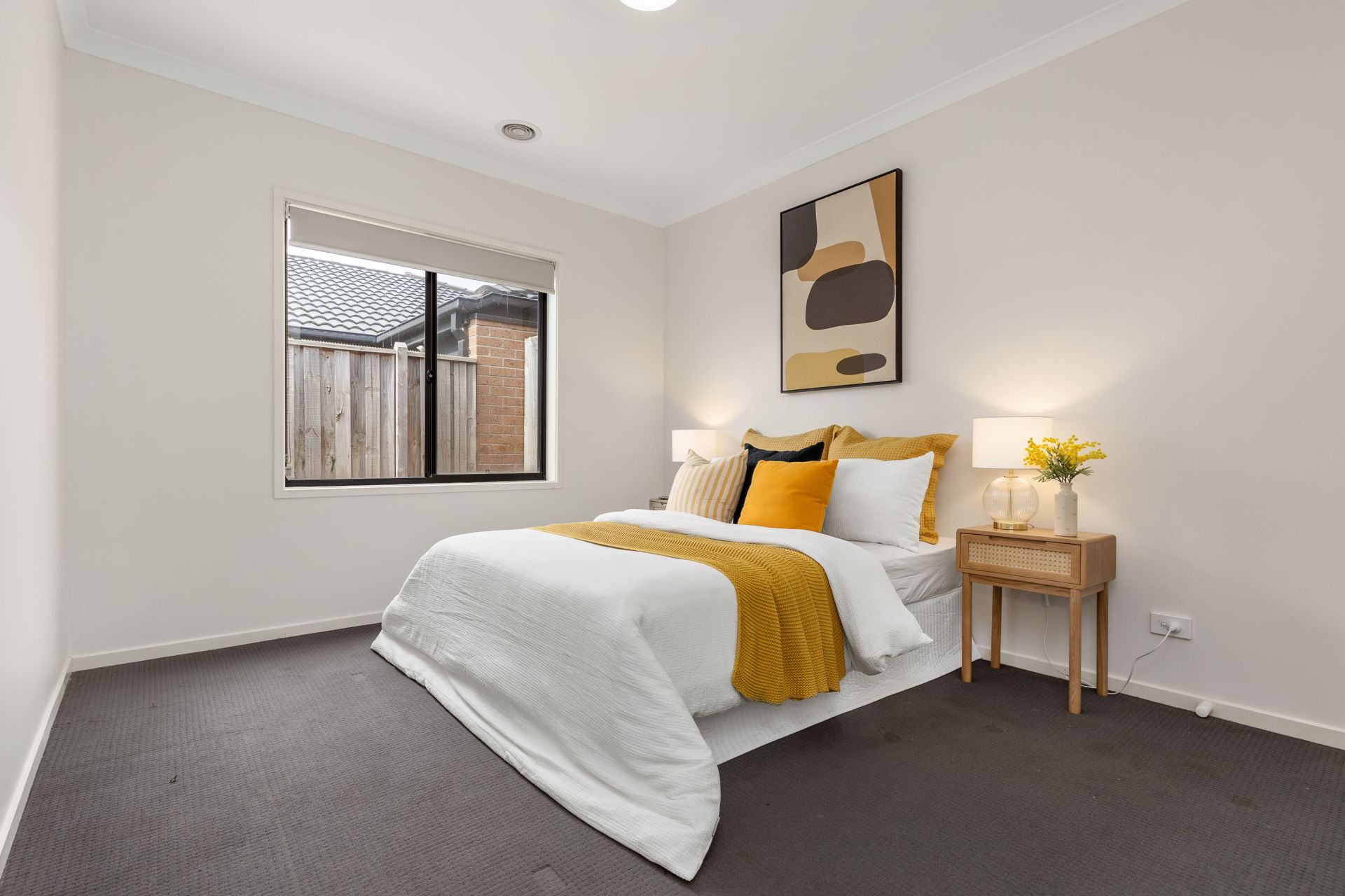 At the heart of the home, you will find a kitchen outfitted with 900mm stainless steel appliances, dishwasher and a walk-in pantry with dedicated fridge space. The open plan living and dining areas are illuminated by sleek downlights, and two separate living zones providing flexibility for entertaining, relaxing, or working from home.